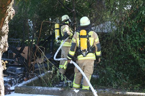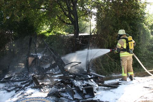 Bei Eintreffen der Feuerwehr brannte ein 2 x 2 m großes Gartenhaus in voller Ausdehnung. Zur Brandbekämpfung wurde ein Trupp unter Atemschutz mit einem C-Rohr eingesetzt. Ein weiteres C-Rohr wurde in Bereitstellung gebracht. Eine weitere Gartenhütte in einem Nachbargarten wurde gekühlt und kontrolliert.