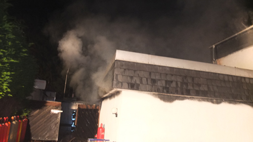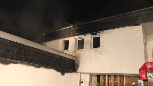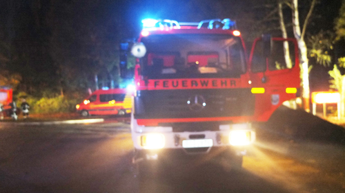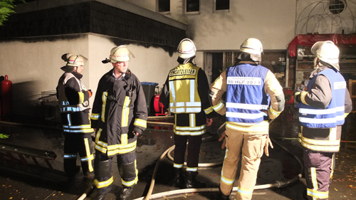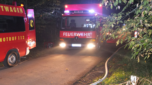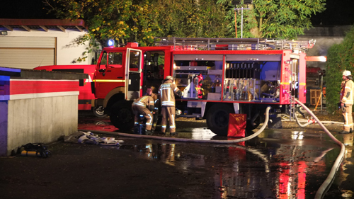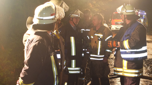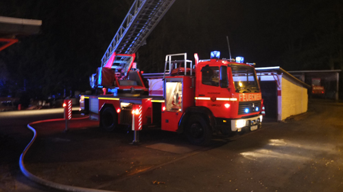 Bei Eintreffen der Feuerwehr stand ein Lagerraum, der direkt mit dem Wohnhaus verbunden ist in Vollbrand. Zur Brandbekämpfung und zum Kühlen von vielen Propangasflaschen wurden zwei Trupps unter Atemschutz mit zwei C-Rohren eingesetzt. Ein dritter Trupp unter Atemschutz wurde über das Wenderohr der Drehleiter eingesetzt. Da an der Giebelseite des Wohnhauses ein Feuerschein sichtbar war, wurden von Außen zwei Trupps unter Atemschutz über die dreiteilige Schiebeleiter beauftragt die Seitenverkleidung des Daches zu entfernen. Der Brandherd wurde lokalisiert und dann abgelöscht. Im gesamten Einsatzverlauf wurden die Propangasflaschen regelmäßig auf eine erhöhte Temperatur überprüft. Ab 02.30 Uhr rückten die Einsatzkräfte nach und nach von der Einsatzstelle ab. Um 03.55 Uhr war der Einsatz für die Feuerwehr beendet und die Einsatzstelle wurde an die Polizei übergeben.