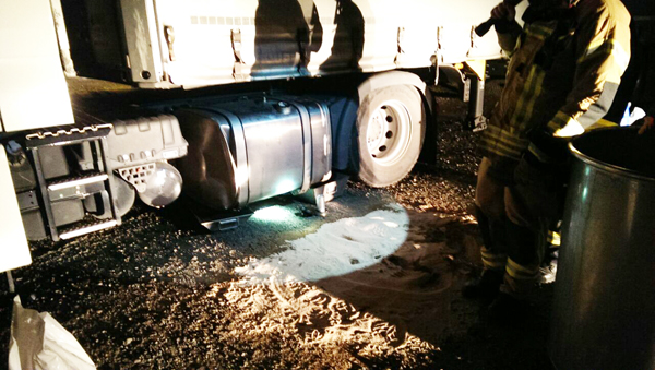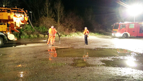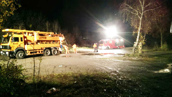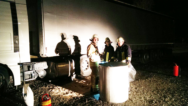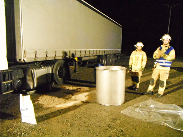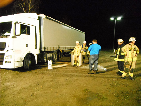 Auf einem Parkplatz hatte sich ein Lkw den Fahrzeugtank an einer Straßenlaterne aufgerissen. Der Dieselkraftstoff wurde mit Schuttmulden aufgefangen. Ausgelaufener Dieselkraftstoff wurde mit Bindemittel abgestreut. Der GW-G mit einem Edelstahlbehälter (500 L) wurde nachgefordert. Pfützen, die sich mit Diesel vermischt hatten wurde von einem Entsorgungsunternehmen abgesaugt. Die Einsatzstelle wurde ausgeleuchtet. Durch eine Elektrofirma wurde die beschädigte Straßenlaterne abgebaut.