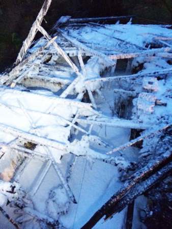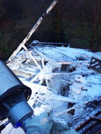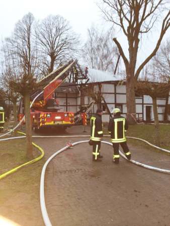 Anforderung der Drehleiter zu Nachlöscharbeiten mit einem Schaumrohr über den Korb der Drehleiter bei einem Brand eines Fachwerkhauses vom 30.01.2014.