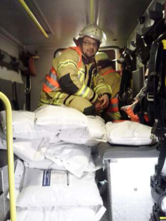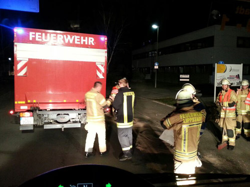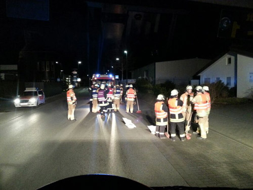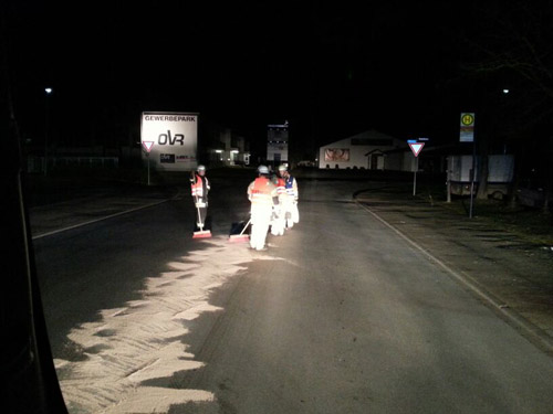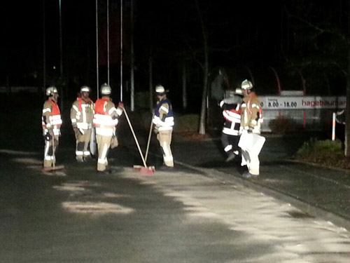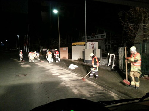 Ölspur von Bökenförder Straße durch das Gewerbegebiet Am Wasserturm über die Rüthener Straße bis nach Erwitte-Eikeloh. Die sehr lange Ölspur wurde von der Feuerwehr abgestreut. Anschließend wurde die Fahrbahn mit einer Kehrmaschine gereinigt und das verbrauchte Ölbindemittel wurde aufgenommen.
