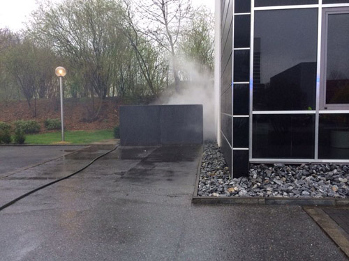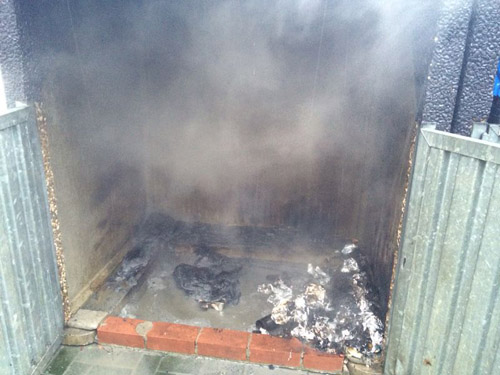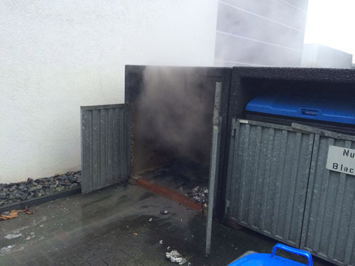 Ein brennender Papiercontainer wurde mit dem Schnellangriff von einem Trupp unter Atemschutz abgelöscht.