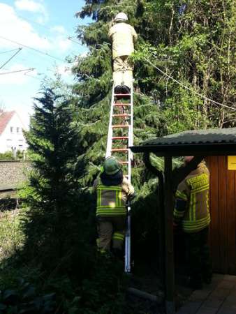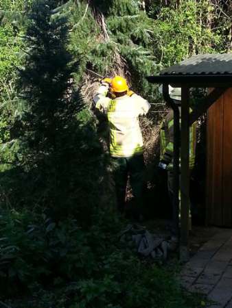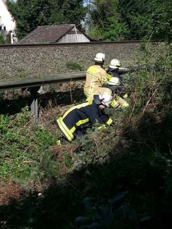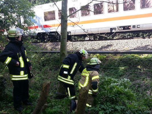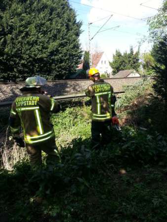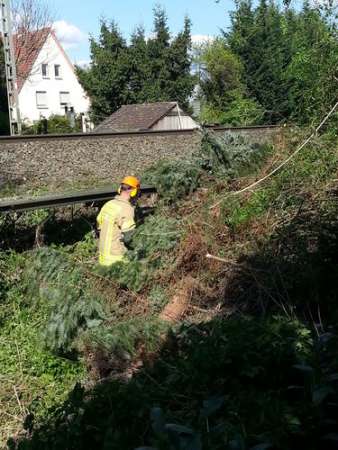 Eine Tanne drohte auf die direkt angrenzende Bahnlinie Lippstadt - Paderborn zu stürzen. Der Baum wurde mit Seilen gesichert und dann kontrolliert gefällt. Der Zugverkehr wurde auf Schrittgeschwindigkeit reduziert.