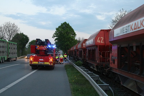 Ein Pkw-Fahrer wollte die eingleisige unbeschrankte WLE-Strecke überqueren um zu einem Grundstück zu gelangen. Dabei prallte der Pkw gegen einen Zug der WLE. Bei Eintreffen der Feuerwehr war weder eine Person eingeklemmt noch gab es verletzte Personen. Der Einsatz von Feuerwehr und Rettungsdienst war nicht erforderlich.