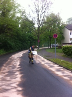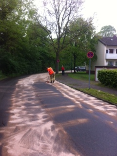 Eine ca. 500 m lange Ölspur wurde von der Feuerwehr mit Ölbindemittel abgestreut. Das verbrauchte Ölbindemittel wurde anschließend von einer Kehrmaschine aufgenommen.