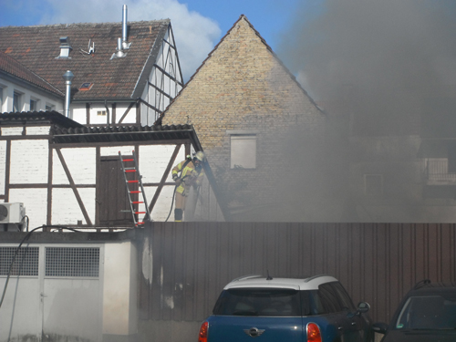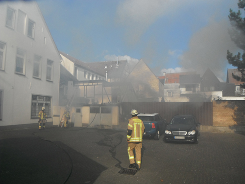 In einem Hinterhof brannten größere Mengen Unrat, ein Kühlschrank und ein Grill. Die Feuerwehr verschaffte sich über ein Garagendach mittels Steckleiter Zugang zur Einsatzstelle. Mehrere Mülltonnen wurden von einer Person entfernt. Ein Gasgrill mit einer 11kg Propangasflasche wurde aus dem Gefahrenbereich geholt. Anschließend wurde der Brand von einem Trupp unter Atemschutz abgelöscht.