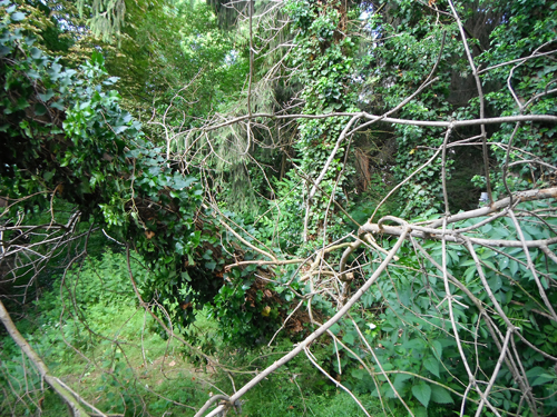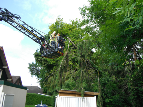 Eine Kiefer in Schräglage drohte auf den Gehweg zu stürzen. Die Kiefer wurde über den Korb der Drehleiter mit Hilfe der Motorsäge zerschnitten.