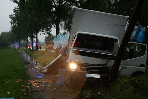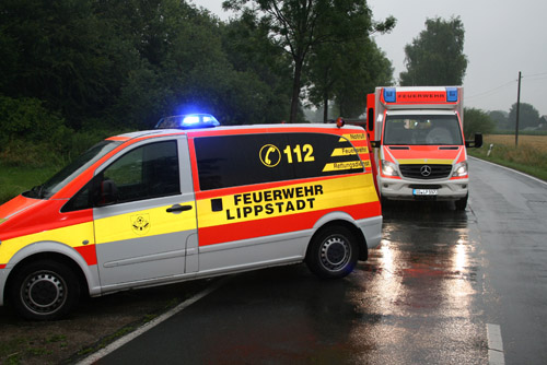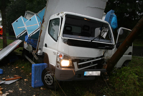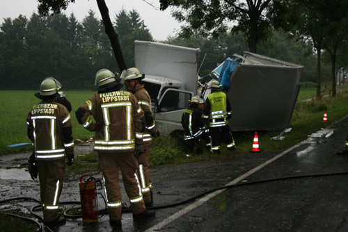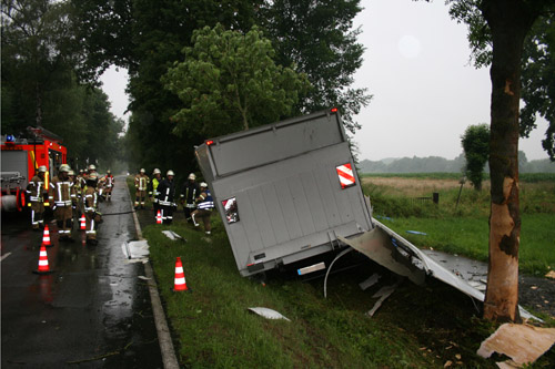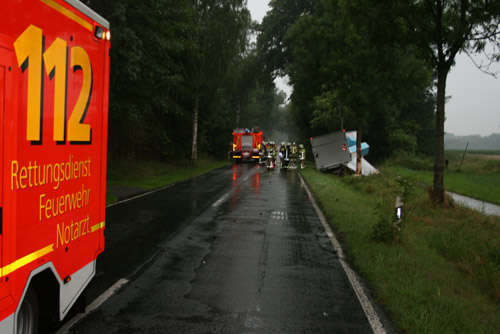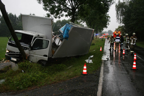 Ein Lkw-Fahrer prallte gegen ein anderes Fahrzeug, kam dadurch von der Fahrbahn ab, prallte dann gegen einen Baum und kam dann vor einem weiteren Baum zum Stillstand. Bei dem Verkehrsunfall war – wie Anfangs gemeldet – keine Person eingeklemmt. Allerdings wurden zwei Personen verletzt und vor Ort vom Rettungsdienst behandelt und anschließend in umliegende Krankenhäuser transportiert.