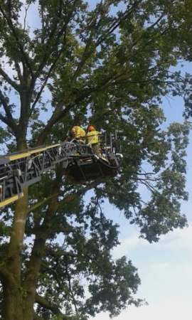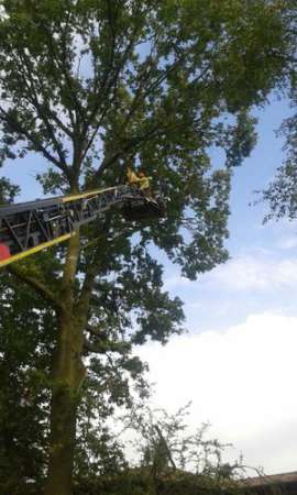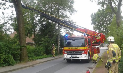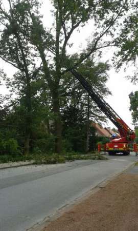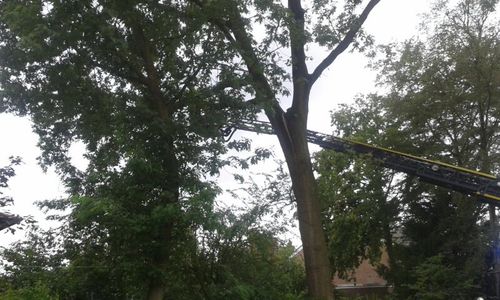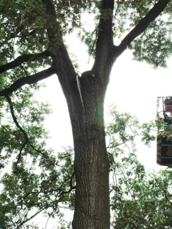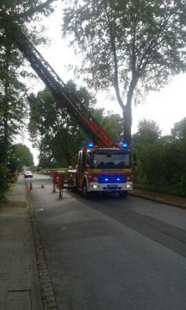 Eine große Eiche, die vermutlich vor einigen Tagen durch einen Blitzschlag quergespalten sein sollte, drohte auseinanderzubrechen und auf ein Wohnhaus zu stürzen. Über den Korb der Drehleiter wurde die Baumkrone abgetragen. Zur Absicherung der Einsatzstelle und Unterstützung bei den Arbeiten waren Polizei und Baubetriebshof vor Ort. Nachdem die Eiche bis zur Querspaltung gefällt worden war konnte der Einsatz der Feuerwehr beendet werden. Der Abtransport der Baumreste erfolgte durch den Baubetriebshof.