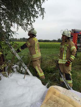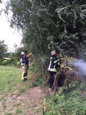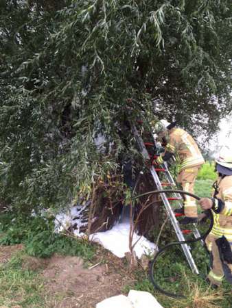 Bei Eintreffen der Feuerwehr brannte eine hohle Weide auf einem freien Feld. Das Feuer war auf einen Schwelbrand im Inneren des hohlen Baumes begrenzt. Eine Schaumpistole wurde zur Brandbekämpfung eingesetzt.