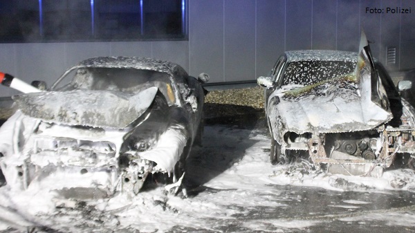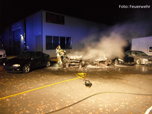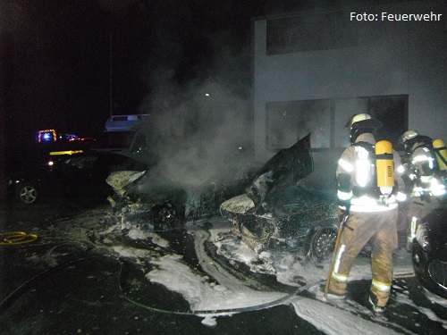 Bei Eintreffen der Feuerwehr brannten zwei PKW in voller Ausdehnung. Die Feuerwehr setzte zur Brandbekämpfung einen Trupp unter Atemschutz ein.