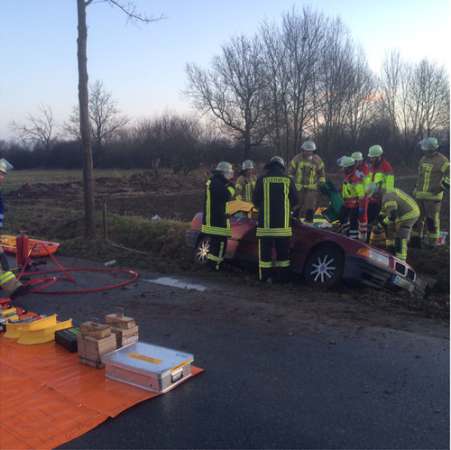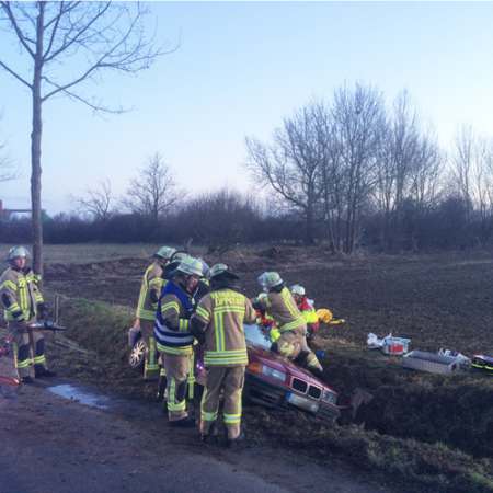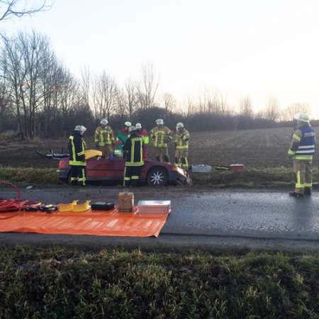 Eine Pkw-Fahrerin war aus ungeklärter Ursache von der Fahrbahn abgekommen und in einem Straßengraben zu stehen gekommen. Da die Frau in Ihrem Pkw eingeschlossen war und aufgrund des Verletzungsmusters wurde die Fahrerin in Absprache mit dem Notarzt patientenschonend gerettet. Hierzu wurde der Pkw stabilisiert und anschließend das Fahrzeugdach mittels hydraulischen Rettungsgeräten abgetrennt. Die Fahrerin wurde an den Rettungsdienst übergeben, der sie dann in ein Krankenhaus transportierte.