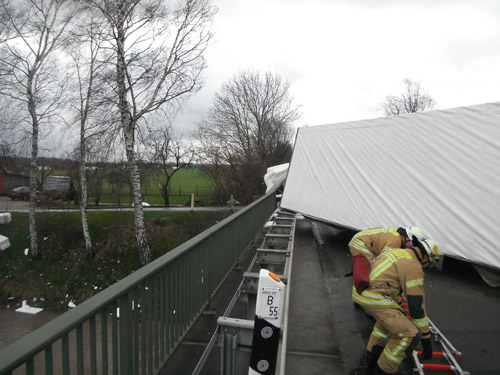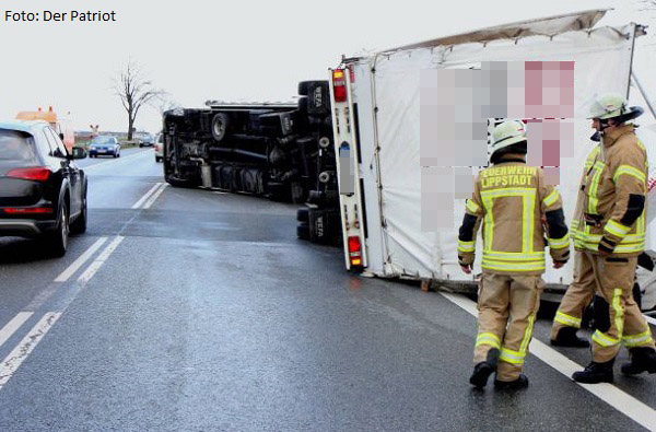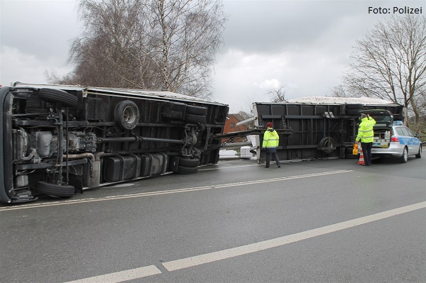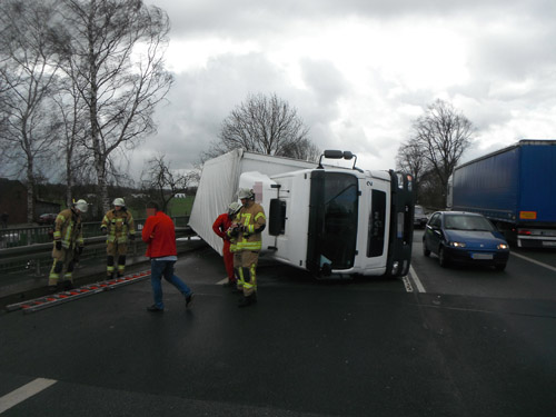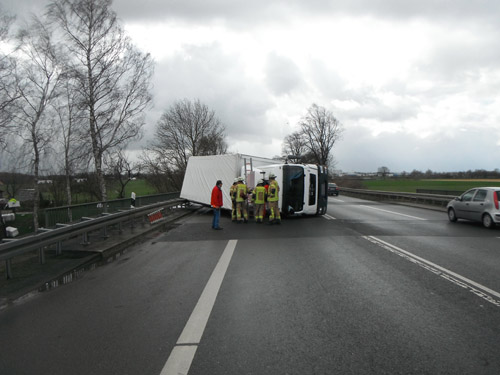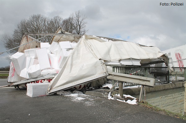 Vermutlich durch eine Windböe ist ein Lkw mit Anhänger umgekippt. Die Feuerwehr sicherte die Einsatzstelle ab und befreite den unverletzten Fahrer aus dem Fahrerhaus mit Hilfe der Steckleiter. Anschließend unterstützte die Feuerwehr beim Umladen der Beladung (Styropor) in ein Reservefahrzeug bis Mitarbeiter der Lippstädter Firma vor Ort waren. Durch ein Bergungsunternehmen aus Anröchte wurden Lkw und Anhänger wieder aufgerichtet.