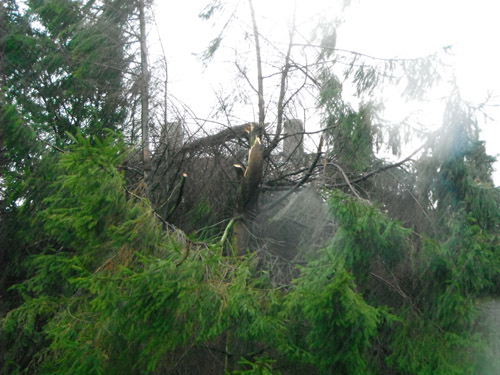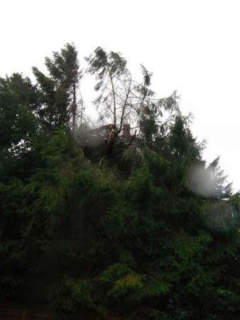 Aus einer Tanne war ein großer Ast auf das Dach eines Wohnhauses gestürzt. Die Feuerwehr sicherte einen angrenzenden Weg mittels Flatterband. Der Eigentümer wurde nachgefordert und aufgefordert eine Fachfirma mit der Beseitigung des Sturmschadens zu informieren.
