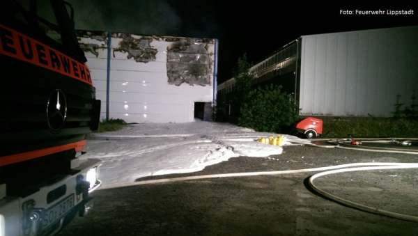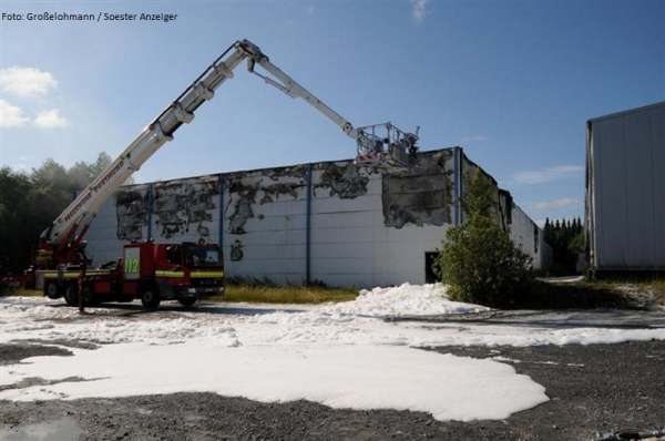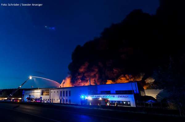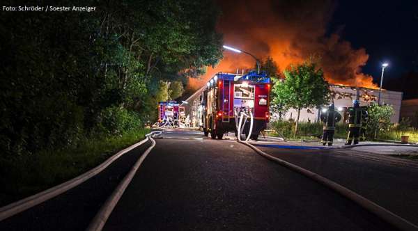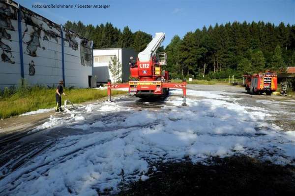 Überörtliche Hilfe leisteten 20 Kameraden der Freiwilligen Feuerwehr bei einem Großbrand in einem Galvanikbetrieb in Warstein. Das TLF 4000 wurde mittels Werfer und die Drehleiter wurde mit dem Wenderohr zur Brandbekämpfung eingesetzt. Anschließend wurde die Drehleiter aus dem Feuerwehrstützpunkt West in Eickelborn am Feuerwehrhaus beim Löschzug Belecke stationiert um den Grundschutz im Stadtgebiet Warstein sicher zu stellen. Einsatzende war hier 10.00 Uhr heute Vormittag. Die Spezialkräfte vom ABC-Erkunder haben Schadstoffmessungen im Umkreis der Einsatzstelle vorgenommen. Der Leitende Notarzt wurde von einem Feuerwehrmann der Feuerwache zur Einsatzstelle gebracht.