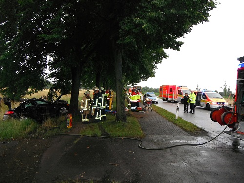 Ein Pkw-Fahrer war von der Fahrbahn abgekommen und frontal gegen einen Straßenbaum geprallt. Bei Eintreffen der Einsatzkräfte war der Fahrer nicht mehr im Pkw eingeklemmt. Der Rettungsdienst versorgte den Fahrer und später erfolgte der Transport in ein Krankenhaus. Aus dem demolierten Pkw liefen Betriebsstoffe aus, die zum Teil in das Erdreich versickert waren. Die Feuerwehr stellte Auffangwannen unter den Pkw. Das betroffene Erdreich wurde durch den städt. Baubetriebshof im Auftrag der Unteren Wasserbehörde Kreis Soest mit Hilfe eines Baggers abgetragen.