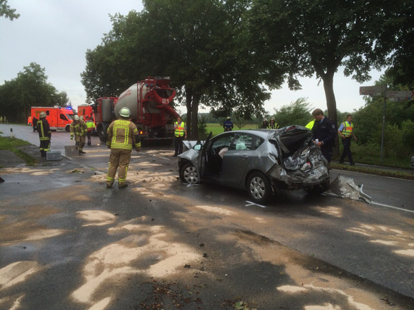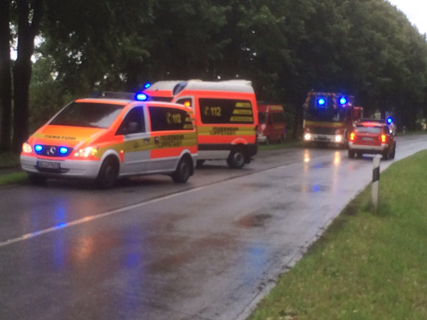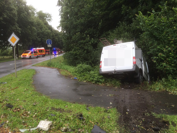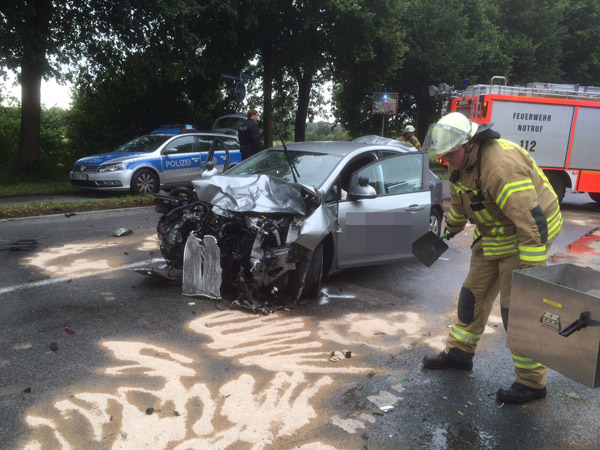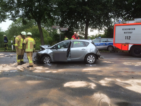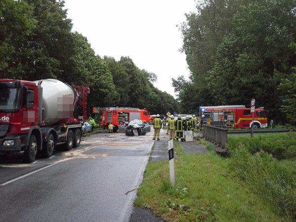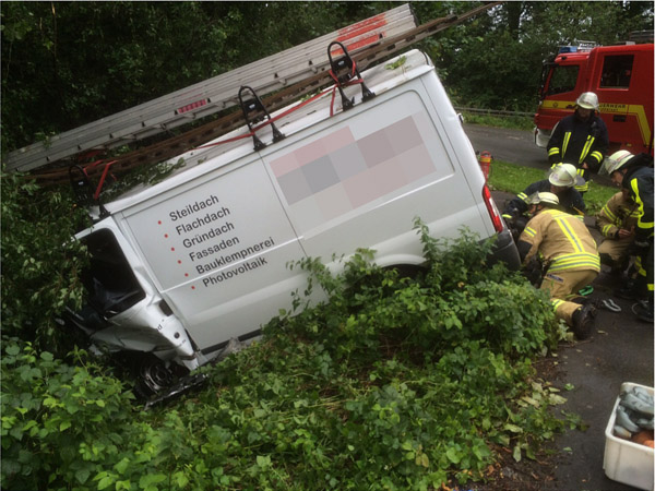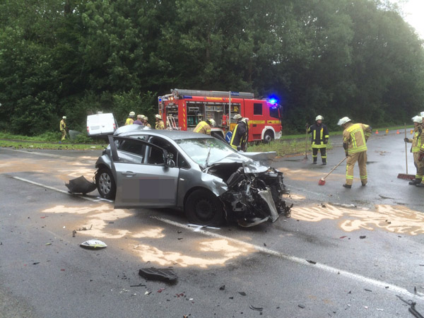 Schwerer Verkehrsunfall im Kreuzungsbereich Friedhardtskirchener Straße / Im Nahtfeld / Hellinghäuser Weg mit einem Lkw, einem Klein-Transporter und einem Pkw. Zunächst war die Rede von zwei eingeklemmten Personen. Das bestätigte sich bei Eintreffen der Einsatzkräfte nicht. Lediglich ein Fahrer war im Klein-Transporter eingeschlossen und konnte mit Muskelkraft von der Feuerwehr befreit werden. Drei Personen wurden verletzt und in die beiden Lippstädter Krankenhäuser transportiert. Durch die Feuerwehr wurden ausgelaufene Betriebsstoffe abgestreut und die Fahrbahn von Fahrzeugteilen gereinigt.
