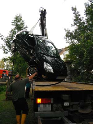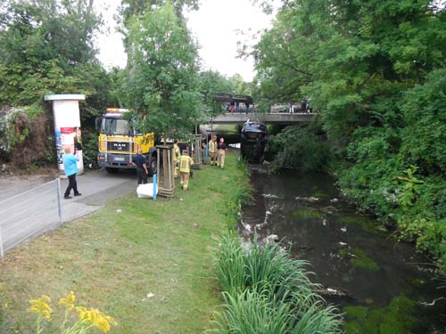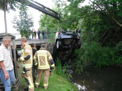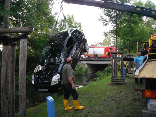 Auf dem Parkplatz vor dem Bahnhof war ein Pkw aus ungeklärter Ursache über die Böschung in die Südliche Umflut gefahren. Beim Eintreffen der Feuerwehr befand sich keine Person mehr im Pkw. Der Pkw stand komplett im Wasser. Betriebsstoffe waren nicht ausgelaufen. Nach der Bergung durch ein Abschleppunternehmen war auf dem Gewässer ein geringer Ölfilm zu erkennen. Eine Ölsperre wurde von der Feuerwehr gesetzt.