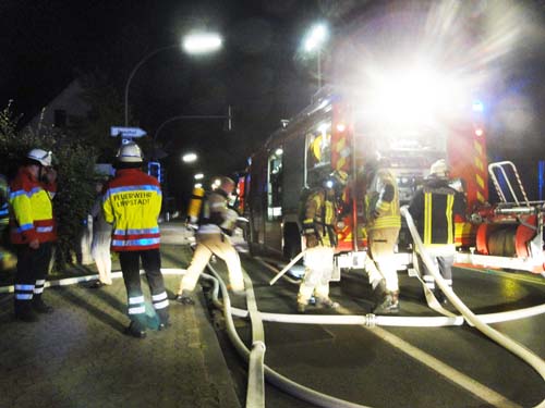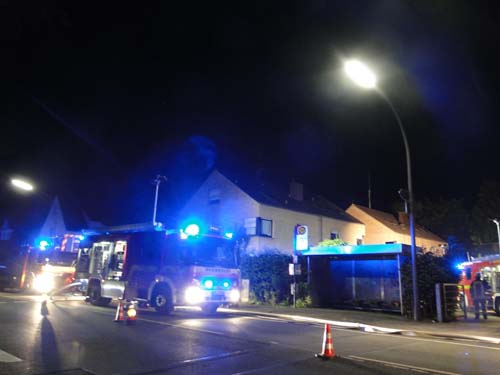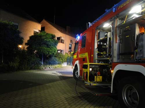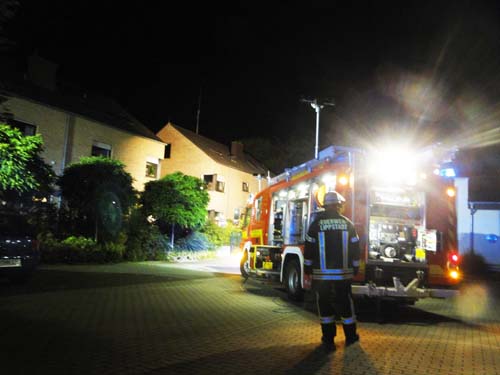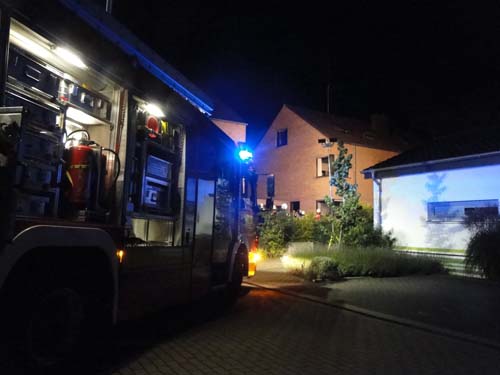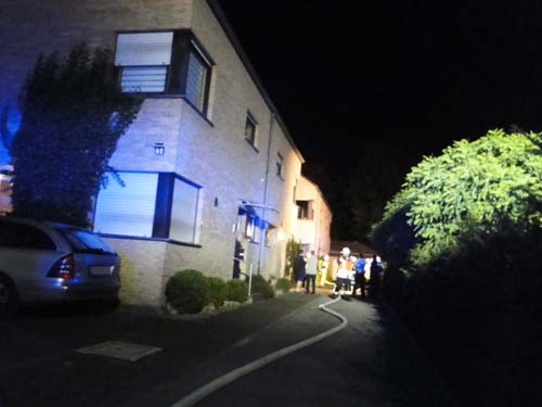 Bei Eintreffen der Feuerwehr brannte das Wohnzimmer in voller Ausdehnung. Das Feuer wurde von einem Trupp unter Atemschutz abgelöscht. Ein weiterer Trupp unter Atemschutz kontrollierte das 1. Obergeschoß und das Dachgeschoß. Nach der Brandbekämpfung wurde der Hochleistungslüfter eingesetzt. Die Bewohnerin wurde mit Verdacht auf eine Rauchgasvergiftung in ein Krankenhaus gebracht.