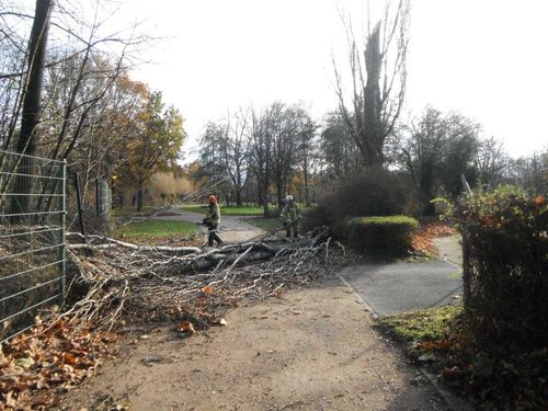 Eine ca. 12 m hohe Pappel war abgebrochen und lag quer über den Gehweg. Der Baum wurde mittels Motorsäge kleingeschnitten und beseitigt.
