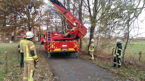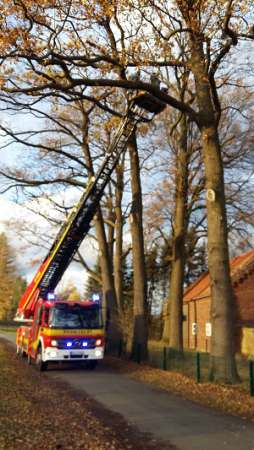 Ein großer Ast drohte auf die Fahrbahn zu stürzen. Der Ast wurde von der Feuerwehr über den Korb der Drehleiter entfernt.
