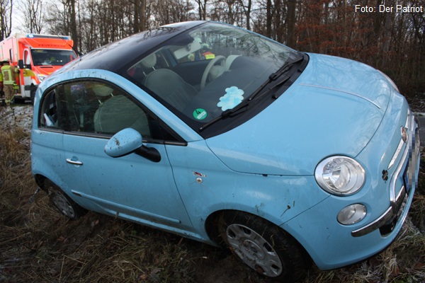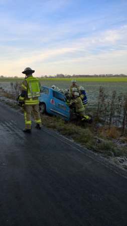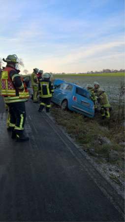 Die Unfallstelle befand sich auf der Horner Straße. Bei Eintreffen der Feuerwehr waren die beiden Fahrzeuginsassen, eine Mutter mit ihrem Kind, schon aus dem Fahrzeug befreit. Die Feuerwehr richtete den Pkw, der auf der Fahrzeugseite im Graben lag, wieder auf und kontrollierte ihn auf auslaufende Betriebsmittel. Des Weiteren wurde die Fahrzeugbatterie abgeklemmt.