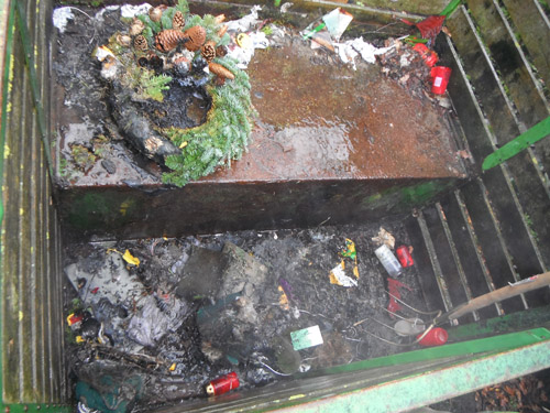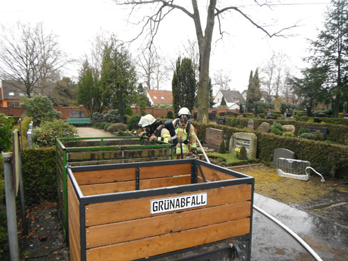 Bei Eintreffen der Feuerwehr brannte der Inhalt eines Grünabfallcontainers. Zur Brandbekämpfung wurde ein Trupp unter Atemschutz mit einem C-Rohr eingesetzt.