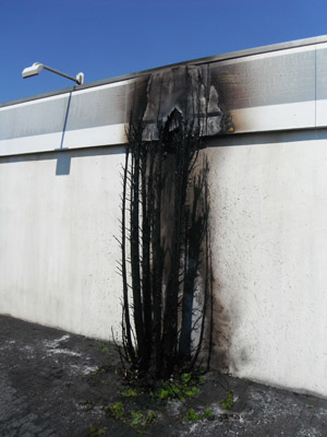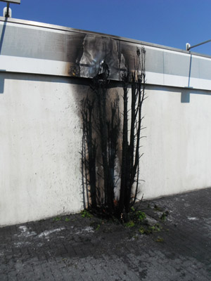 Durch Abbrennen von Unkraut war ein Baum und Teile einer Gebäudefassade eines Betriebs in Brand geraten. Der Brand wurde mit dem Schnellangriff abgelöscht. Der Brandbereich wurde mit der Wärmebildkamera kontrolliert. Zwei Blechteilte der Gebäudefassade wurde abmontiert.
