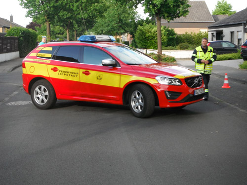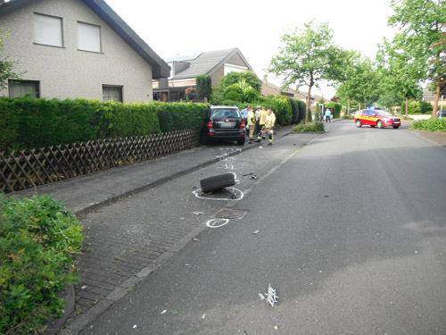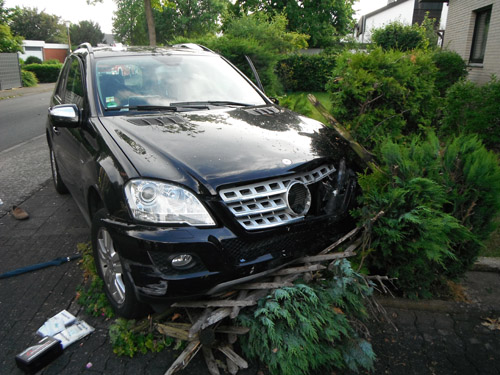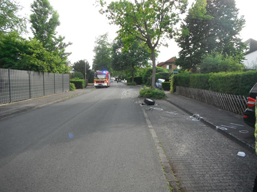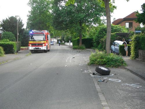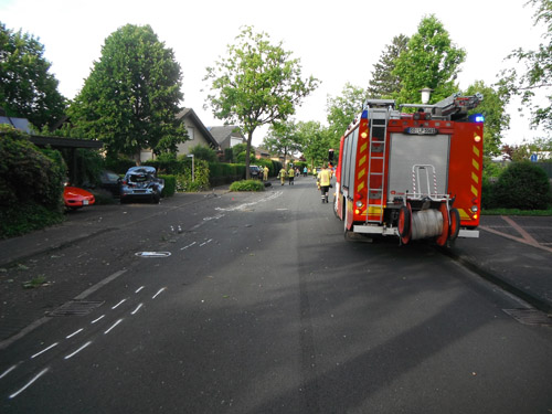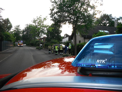 Auf Grund eines plötzlichen Schwächeanfalls des Fahrers geriet der PKW außer Kontrolle, touchierte auf einer Länge von etwa 200 Metern zwei Mauern sowie einen Baum, und kollidierte dann mit einem am Straßenrand stehenden PKW. Durch die Wucht des Aufpralls wurde dieser auf ein weiteres Fahrzeug geschoben. Der Fahrer wurde von der Feuerwehr mit der sogenannte Crash-Rettung aus dem Fahrzeug befreit. Der Rettungsdienst wurde bei der Behandlung und beim Transport zum Rettungswagen unterstützt. Die Psychosoziale Notfallversorgung wurde alarmiert und kümmerte sich vor Ort um Angehörige des Fahrers und Anwohner. Über die Unfallaufnahme durch die Polizei wurde die Drehleiter des Feuerwehrstützpunktes West alarmiert.