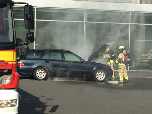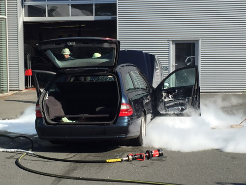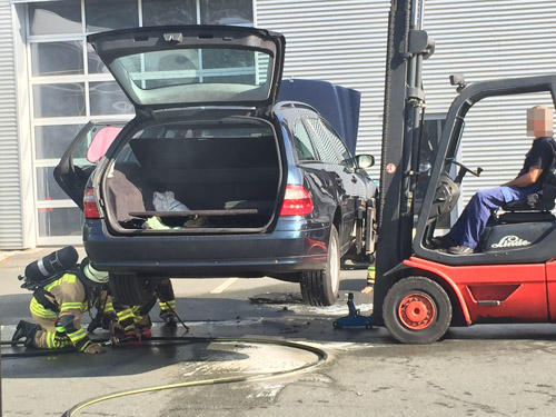 Auf einem Firmengelände brannte bei Eintreffen der Feuerwehr ein Pkw. Zur Brandbekämpfung wurde ein Trupp unter Atemschutz mit Wasser und Schaum eingesetzt. Diverse Kunststoffverkleidungen wurden demontiert. Die Fahrzeugfront sowie der Unterboden wurden abgelöscht.