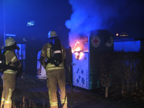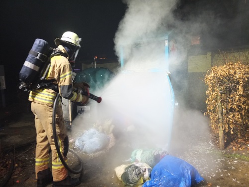 Bei Eintreffen der Feuerwehr brannte ein Altkleidercontainer. Zur Brandbekämpfung wurde ein Trupp unter Atemschutz mit dem Schnellangriff eingesetzt.