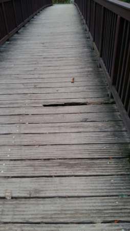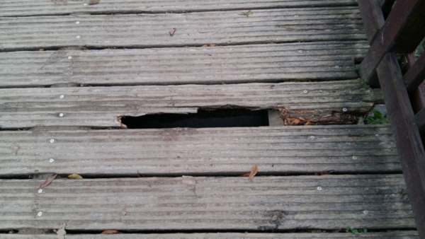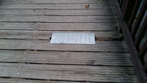 Ein defektes Brett auf einer Holzbrücke wurde von der Feuerwehr mit einem Riffelblech abgedeckt und verschraubt.