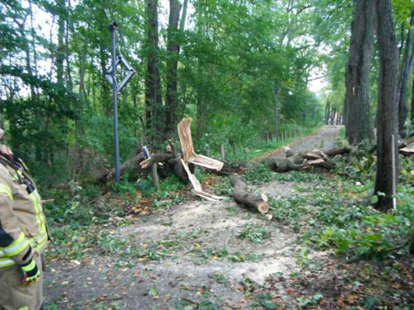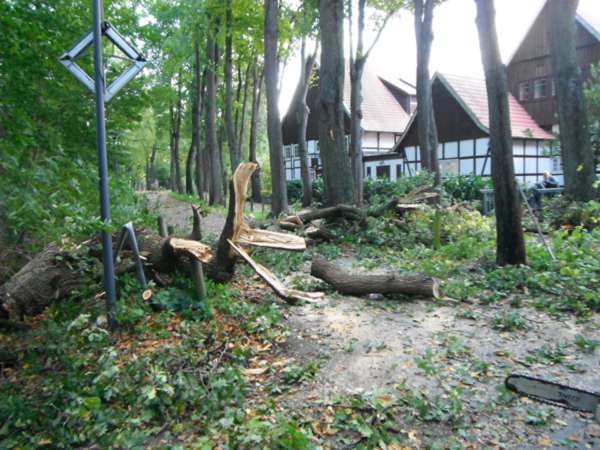 Eine Baumkrone einer Eiche wurde abgebrochen und blockierte die Fahrbahn. Die Baumkrone wurde mit Hilfe der Motorsäge zerlegt. In einem anderen Baum befanden sich lose Äste. Diese wurde über den Korb der Drehleiter aus dem Baum entfernt.