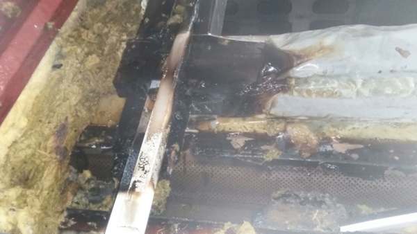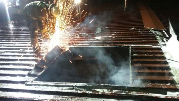Durch die Hitzeentwicklung in der Halle haben sich Glutnester im Dachbereich gebildet. Um eine weitere Brandausbreitung auszuschließen wurden aufwendig das Trapezblech und Dämm- und Befestigungsmaterial von fünf Kameraden, die sich gesichert auf dem Dach befunden haben, mit unterschiedlichen technischen Geräten entfernt. Des Weiteren wurde eine Lichtkuppel entfernt.