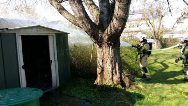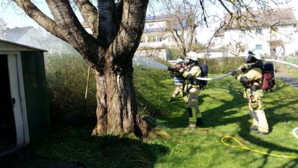 Brennender Kompost an einem Gartenhaus. Für Nachlöscharbeiten wurde ein Trupp unter Atemschutz mit einem C-Rohr eingesetzt. Zuvor haben aufmerksame Nachbarn erste Löschmaßnahmen mit zwei Gartenschläuchen eingeleitet.