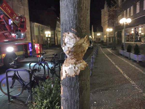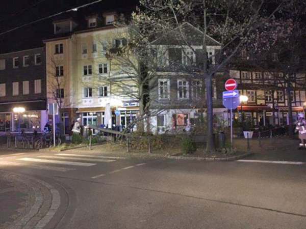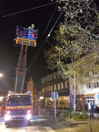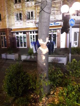 Ein ca. 8 m hoher und ca. 30 cm dicker Baum wurde von einer Person mittels einer Axt versucht zu fällen. Der Baum war so stark beschädigt worden, dass er von der Feuerwehr gefällt werden musste. Die Polizei sperrte dei Einsatzstelle mit Flatterband ab. Die Überreste von dem Baum sind vom städt. Baubetriebshof abgeholt worden. Ein Stromkabel für die Weihnachtsbeleuchtung wurde beschädigt.