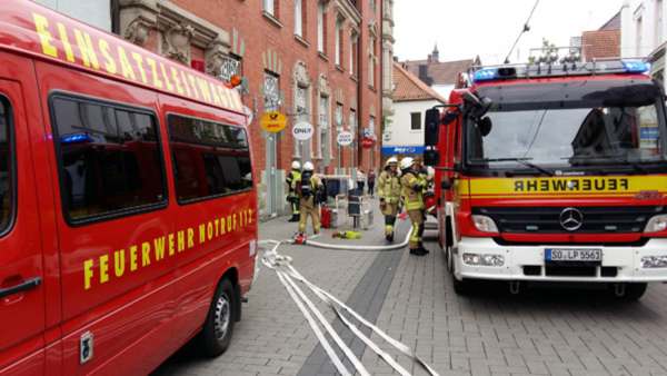 Die Feuerwehr Lippstadt wurde heute Nachmittag um 14.53 Uhr aufgrund einer Rauchentwicklung zu einem Geschäftshaus (Schreibwarengeschäft) in die Fußgängerzone alarmiert. Aus ungeklärter Ursache brannte ein Vorschaltgerät in der Zwischendecke in einer Höhe von ca. 3 m. Bei Eintreffen der Feuerwehr waren offenen Flammen sichtbar. Zur Brandbekämpfung wurde ein Trupp unter Atemschutz mit einem C-Rohr eingesetzt. Anschließend wurde das Gerät ausgebaut und aus dem Gebäude entfernt. Von der Rauchentwicklung war auch ein direkt angrenzendes Bekleidungsgeschäft betroffen. In beiden Geschäften wurde der Hochleistungslüfter zum querlüften eingesetzt. Verletzt wurde niemand.