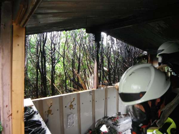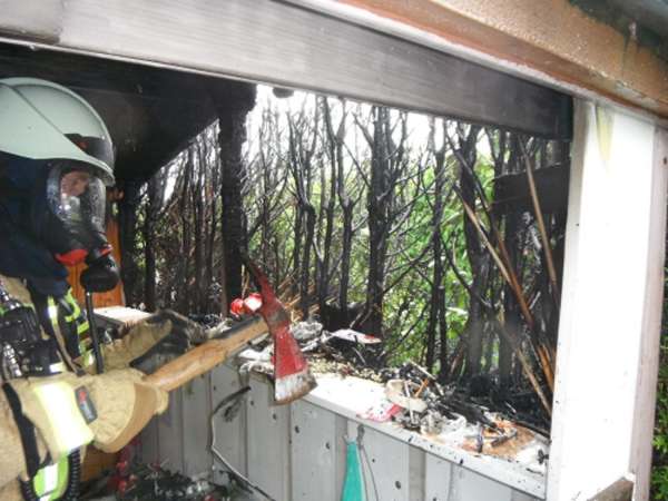 In einer Kleingartenanlage brannte eine Lebensbaumhecke und die Rückwand einer Gartenlaube. Zur Brandbekämpfung wurde ein Trupp unter Atemschutz mit dem Schnellangriff eingesetzt.
