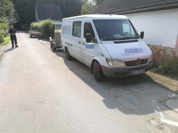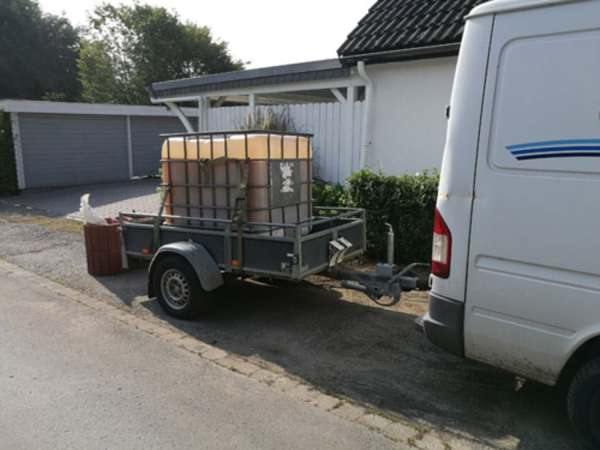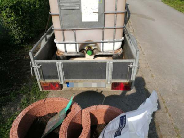 Aus einem 1.000 Liter IBC Container waren 0,5 Liter einer unbekannten Flüssigkeit ausgetreten. Der Kugelhahn wurde mit einem Blindstopfen abgedichtet. Die ausgelaufene Flüssigkeit wurde mit Bindemittel abgestreut.