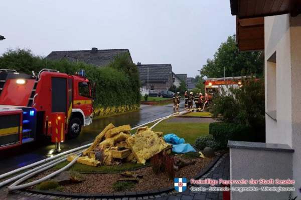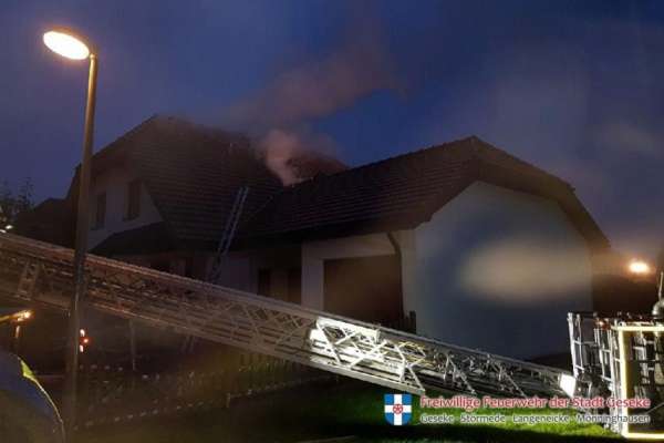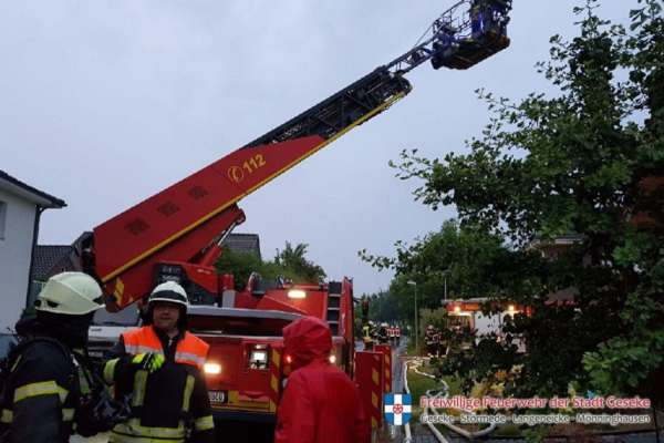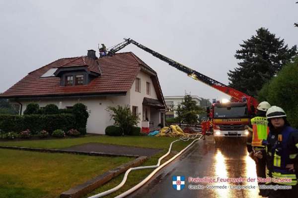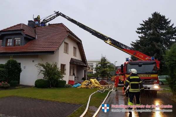 Die Drehleiter der hauptamtlichen Wachbereitschaft wurde zur Unterstützung der Feuerwehr Geseke bei einem Dachstuhlbrand nach einem Blitzeinschlag angefordert. Die Brandbekämpfung war weitesgehend abgeschlossen. Mit dem Gelenkarm war der Dachfirst besser zu erreichen. Die Dachhaut wurde geöffnet und die Dachfläche kontrolliert. Es wurden keine Glutnester mehr gefunden. Abschließung wurde das geöffnete Dach mittels Plane und Arbeitsleinen gegen Regen abgedeckt und gesichert.