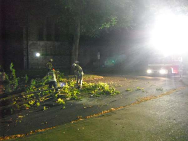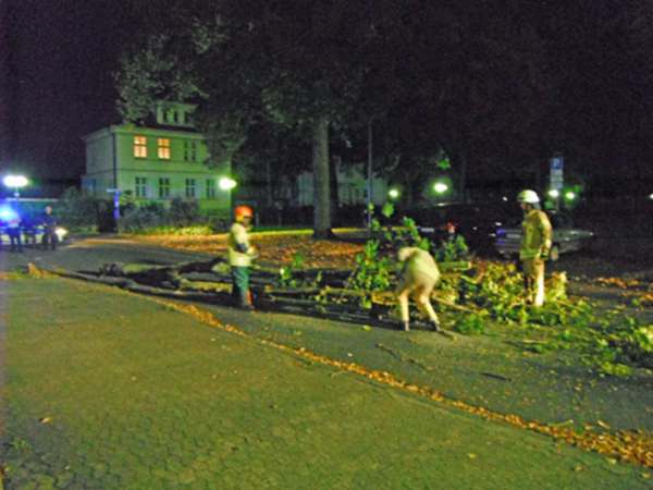 Ein ca. 40 cm dicker und 10 m langer Baum lag auf der Fahrbahn und wurde von der Feuerwehr mittels Kettensäge beseitigt.