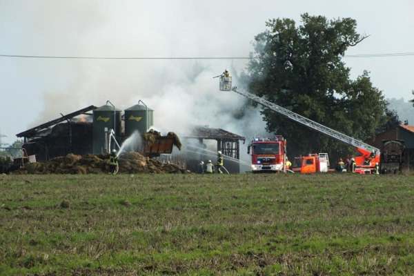 Die Drehleiter wurde zur Unterstützung bei der Brandbekämpfung einer in voller Ausdehnung brennenden Scheune eingesetzt.