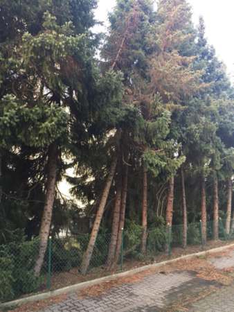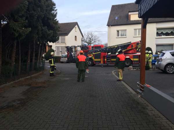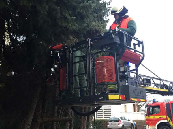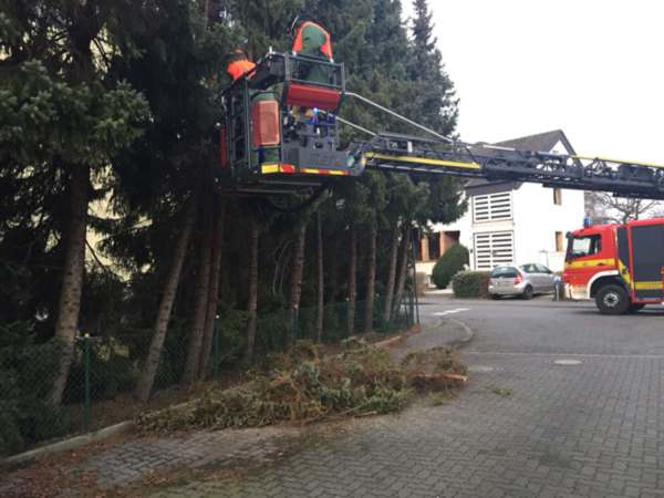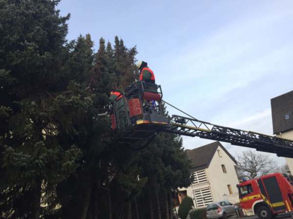 Eine ca. 8 m hohe Tanne drohte auf die öffentliche Verkehrsfläche zu stürzen. Durch die Feuerwehr wurde der Baum beseitigt.