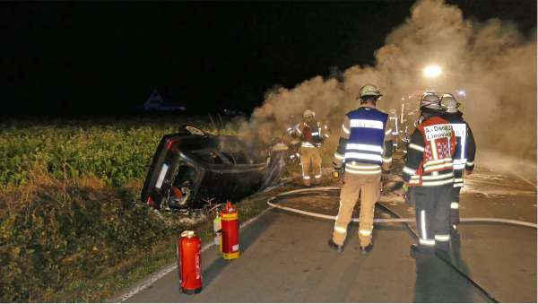 Gemeldet wurde ein Verkehrsunfall und Pkw-Brand auf der Ostinghauser Straße in Lippstadt-Eickelborn. Tatsächlich befand sich die Einsatzstelle auf der Eickelborner Straße in Bad Sassendorf-Ostinghausen. Aus unbekannter Ursache ist ein Pkw von der Fahrbahn abgekommen und in einem Graben zum Stillstand gekommen und in Brand geraten. Es konnte nicht ausgeschlossen werden, dass sich noch Personen im Fahrzeug befinden. Der Pkw-Brand wurde von einem Trupp unter Atemschutz mit Schaum abgelöscht. Personen befanden sich nicht mehr im Fahrzeug.