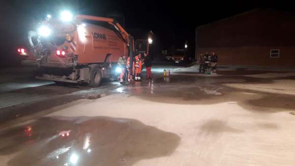 Auf dem Gelände eines landwirtschaftlichen Betriebes ist beim Entladen eines LKW die Hydraulikleitung geplatzt. Bedingt dadurch ist auf einer Fläche von ca. 100 qm² Hydrauliköl ausgetreten. Durch die Feuerwehr wurde die weitere Ausbreitung verhindert. Die Einsatzstelle wurde durch die Löschgruppe Dedinghausen ausgeleuchtet. Das Ordnungsamt und die Untere Wasserbehörde sind informiert worden. Ein Entsorgungsunternehmen wurde beauftragt die betroffene Fläche zu säubern und das verbrauchte Ölbindemittel aufzunehmen.