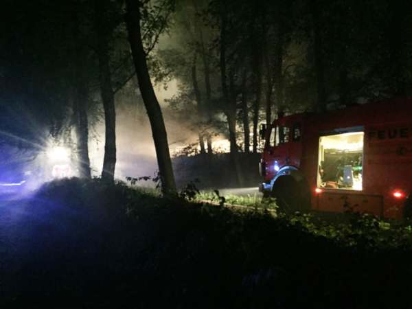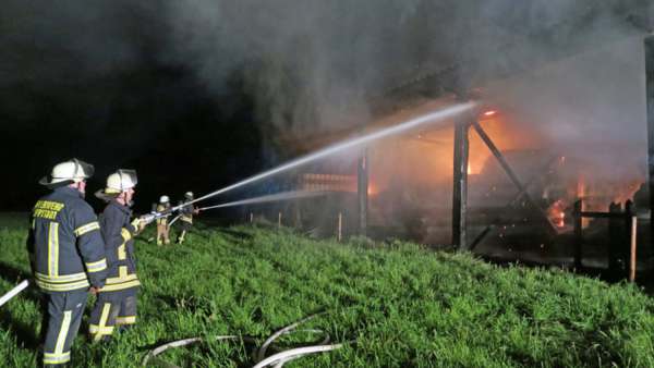 Aus ungeklärter Ursache brannte bei Eintreffen der Feuerwehr ein Unterstand und die darunter abgestellten landwirtschaftlichen Geräte und gelagerten Strohballen. Zur Brandbekämpfung wurden mehrere Trupps, teilweise unter Atemschutz, mit drei C-Rohren und einem B-Rohr eingesetzt. Anschließend wurden die Strohballen aus dem Unterstand transportiert und auf dem Feld auseinander gezogen um den Brand vollständig löschen zu können.