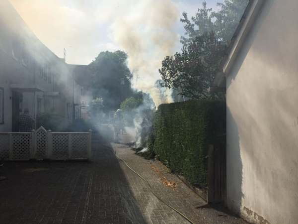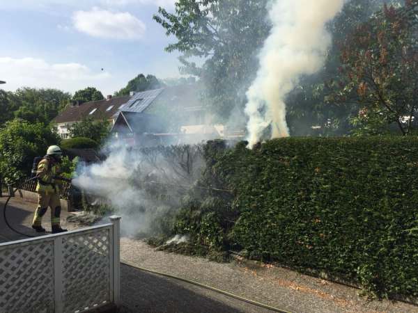 Bei Eintreffen der Feuerwehr brannte eine Hecke auf einer Länge von ca. 6 m. Durch einen Trupp unter Atemschutz wurde der Heckenbrand mit einem C-Rohr abgelöscht. Anschließend wurde die Hecke auf Glutnester kontrolliert.