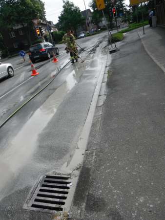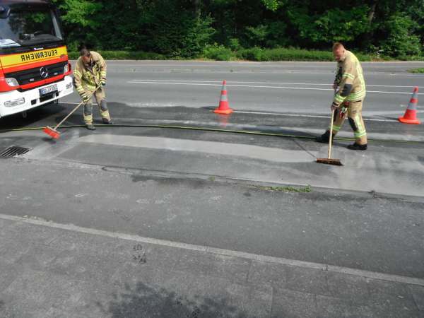 Im Kreuzungsbereich Barbarossastraße / Wiedenbrücker Straße wurde eine starke Verschmutzung der Straße festgestellt. Es handelte sich um Bohrschlamm von einer Baustelle, der sich auf einer Fläche von ca. 60 qm verteilt hatte. Nach Absprache mit der Polizei wurde die Fahrbahn von der Feuerwehr mit dem Schnellangriff und Besen gereinigt.