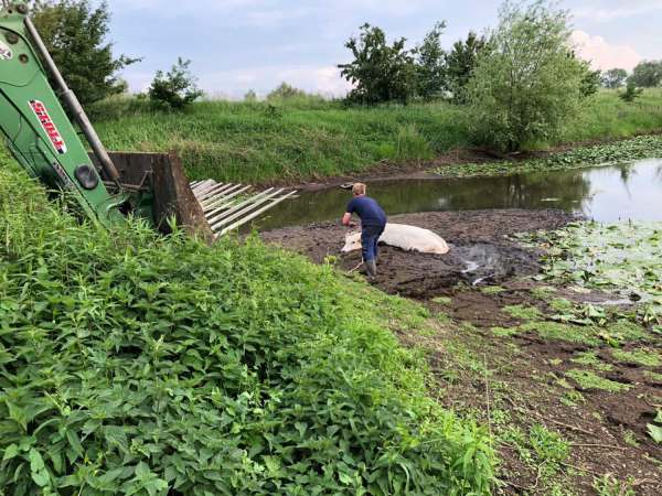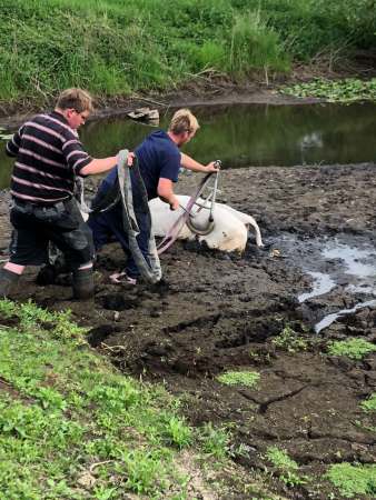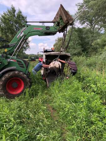 Ein ca. 600 kg schweres Rind steckte in der Glenne (Einmündung Boker Kanal) fest. Da die Möglichkeiten der Feuerweh für so eine Tierrettung begrenzt sind, wurde ein Landwirt hinzugezogen. Der Landwirt und seine Söhne erschienen mit zwei Traktoren und Hebegeschirr an der Einsatzstelle um das Tier zu befreien. Der Landwirt und seine Söhne hatten schon mal Ende Juli 2017 eine ähnliche Rettungsaktion für die Feuerwehr durchgeführt.