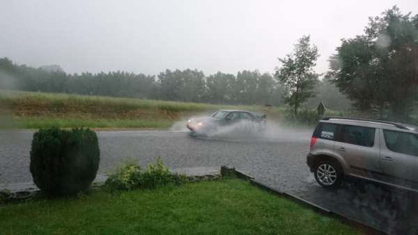 Die Wassermassen sind von einer Senke in der Fahrbahn in ein Gebäude gelaufen. Das Wasser wurde aus dem Gebäude gepumpt. Warnschilder sind durch den Baubetriebshof aufgestellt worden.